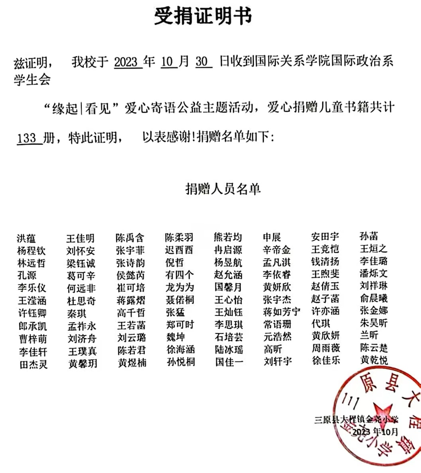 “榈庭多落叶,慨然知已秋。”时近葭月,情满日晖。国际关系学院国际政治系学生会于10月底成功举办了“情自坡上,以书传善”校园公益摄影活动。同学们捐一缕书香,献一份爱心,为山区留守儿童不远万里送去了温暖。