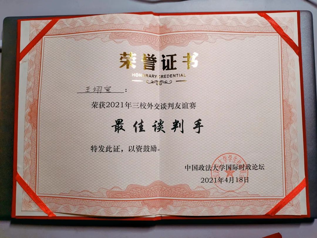 最终,国研会代表我校获得了总分第一名的好成绩,王翊宣获得“最佳谈判手”荣誉称号。