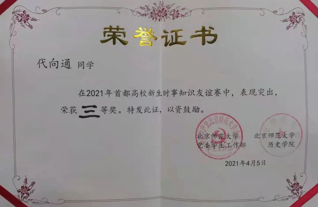 2021年4月5日,由北京师范大学党委学生工作部和历史学院主办,北京师范大学“形势与政策”小组承办的第十届首都高校新生时事知识友谊赛在北京师范大学敬文讲堂举行。北京师范大学国际交流与合作处港澳台事务办公室杜思璇老师担任评委,北京师范大学历史学院副教授、历史学博士江天岳担任主考官。
