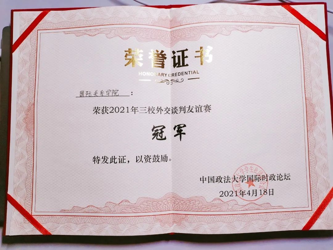 2021年4月18日上午,由国际关系学院国际问题研讨会、中国政法大学国际时政论坛与外交学院时事研究协会共同参与的三校外交谈判友谊赛在中国政法大学举行。这项活动由中国政法大学发起,已有多年传统。本次谈判赛由国家安全学院国际政治系2020级代向通、王翊宣和外语学院日语系2020级王嘉禾三位选手参加。