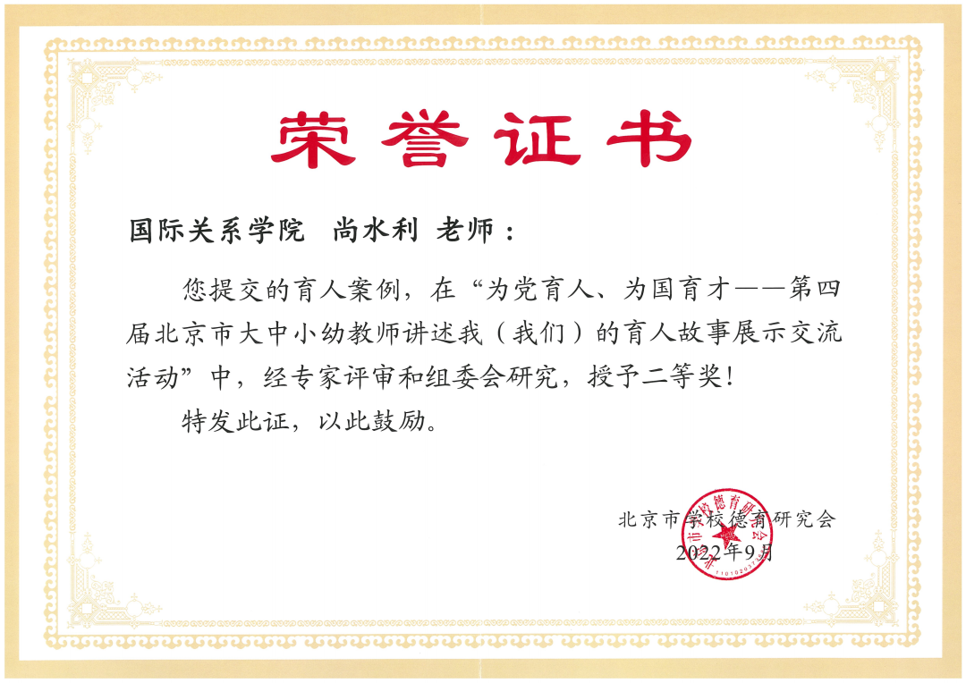 本届活动是2022年北京教育系统“请党放心、强国有我”主题教育和庆祝第38个教师节的重要活动之一,我院两位教师的案例在全市300多个优秀故事案例中脱颖而出。文化与传播系刘俊阳老师“心向往之并力行之”育人故事案例荣获一等奖,公共管理系尚水利老师“以爱育人 以课育才”育人故事案例荣获二等奖。