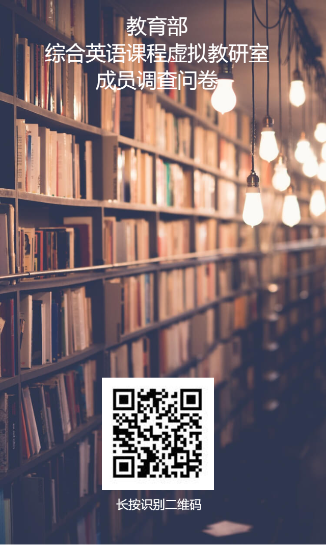 如果您已经成为综合英语课程虚拟教研室成员,麻烦您拨冗抽出5分钟时间填写一下问卷。本问卷旨在了解虚拟教研室成员的一些基本信息和主要需求,从而更好地开展虚拟教研室活动,实现课程建设和交流、教学资源共建共享、协同教学研究的目标。 您可以通过点击链接或扫描二维码的方式方式参与,十分感谢!