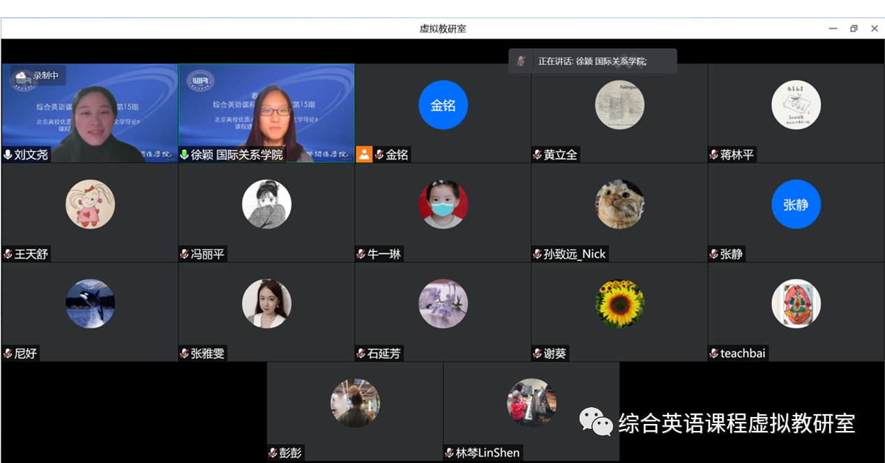 2023年11月7日晚7点到9点,综合英语课程虚拟教研室第15期活动在线上开展。本期活动属于虚拟教研室五大活动版块之“课程建设大家说”,主题为“《英国文学导论》课程建设与课例分享”,由国际关系学院刘文尧博士主讲,综合英语课程虚拟教研室负责人金铭副教授主持。