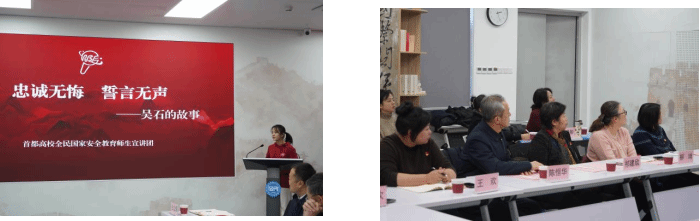 随后双方单位开展联合党建活动,与会领导老师共同观看了我校75周年校庆宣传片,直观深入地了解了我校坚持政治建校的传统及近年来学院在党建工作、学科建设、科研成果和人才培养等方面取得的丰硕成绩。一同聆听了首都全民国家安全教育师生宣讲团的宣讲,国家安全学院国家安全学专业大一的学生宣讲员冉宇轩作《忠诚无名 誓言无声》的主题宣讲,讲述隐蔽战线无名英雄吴石将军的英雄事迹,与会人员深受感动,为之动容。