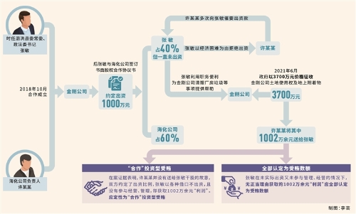 其中,2018年10月,时任泗洪县委常委、政法委书记的张敏与海化公司负责人许某某合作成立金刚公司,专门用于购买泗洪某破产企业天然缘公司资产。2018年11月,金刚公司拍得天然缘公司资产,款项均由海化公司支付。2019年3月,张敏与海化公司签订书面股权合作协议书,约定出资1000万元,张敏占40%,海化公司占60%,但张敏一直未出资。其间,许某某多次向张敏催要出资款,张敏均以经济困难为由拒绝。后张敏利用职务便利为金刚公司清理厂房垃圾、海化公司办理贷款等事项提供帮助。2021年6月,政府以3700万元价格征收金刚公司土地使用权及地上附着物,许某某将其中1002万余元送给张敏。