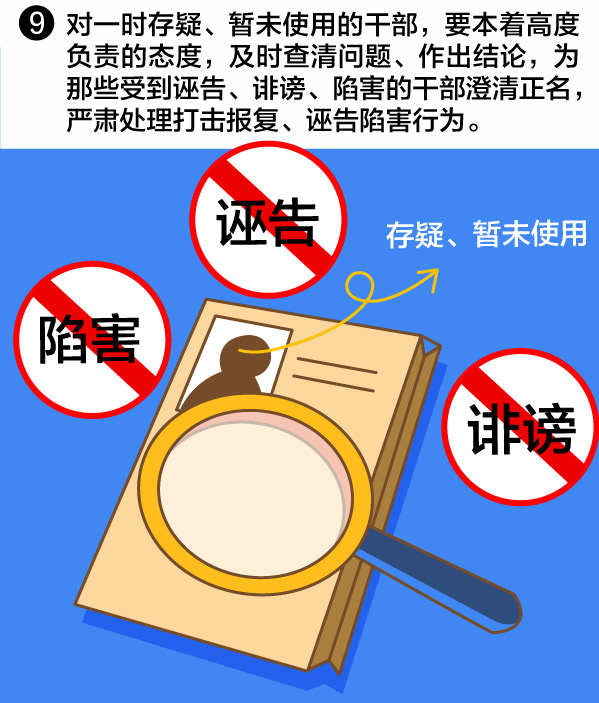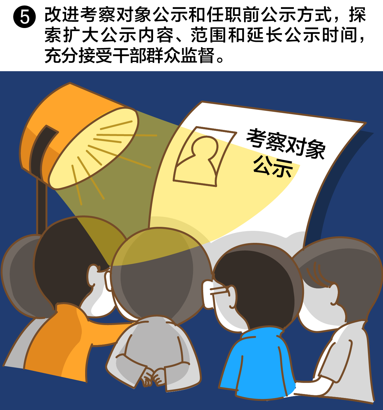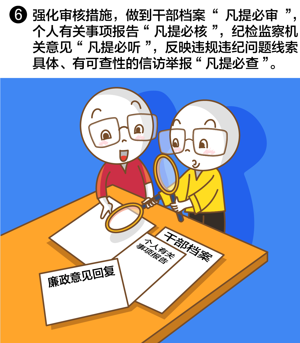 强化任前把关。考察工作要突出针对性、增强灵活性、提高有效性,针对不同考察对象的具体情况,细化考察内容,改进考察方式,力争考察结果全面、客观、准确。选好配强考察工作人员,明确考察谈话保密与承诺责任,营造讲真话的氛围,提高考察质量。根据考察对象履历、家庭关系、社会背景等情况,抓住重要行为特征,有针对性地找知情人谈话。适当拉开考察与会议讨论的时间间隔,采取民意调查、专项调查、延伸考察、实地走访、家访等办法,广泛深入地了解干部。改进考察对象公示和任职前公示方式,探索扩大公示内容、范围和延长公示时间,充分接受干部群众监督。强化审核措施,做到干部档案“凡提必审”,个人有关事项报告“凡提必核”,纪检监察机关意见“凡提必听”,反映违规违纪问题线索具体、有可查性的信访举报“凡提必查”。前移审核关口,做到动议即审,该核早核。对发现问题影响使用的,及时中止选拔任用程序;疑点没有排除、问题没有查清的,不得提交会议讨论或任用。对一时存疑、暂未使用的干部,要本着高度负责的态度,及时查清问题、作出结论,为那些受到诬告、诽谤、陷害的干部澄清正名,严肃处理打击报复、诬告陷害行为。坚持事业为上、公道正派,保护作风过硬、敢作敢为、锐意进取的干部,对那些想干事、能干事、敢担当、善作为的干部要旗帜鲜明地撑腰鼓劲、大胆使用。(摘自《关于防止干部“带病提拔”的意见》)(中央纪委监察部网站 王婵 王洁)