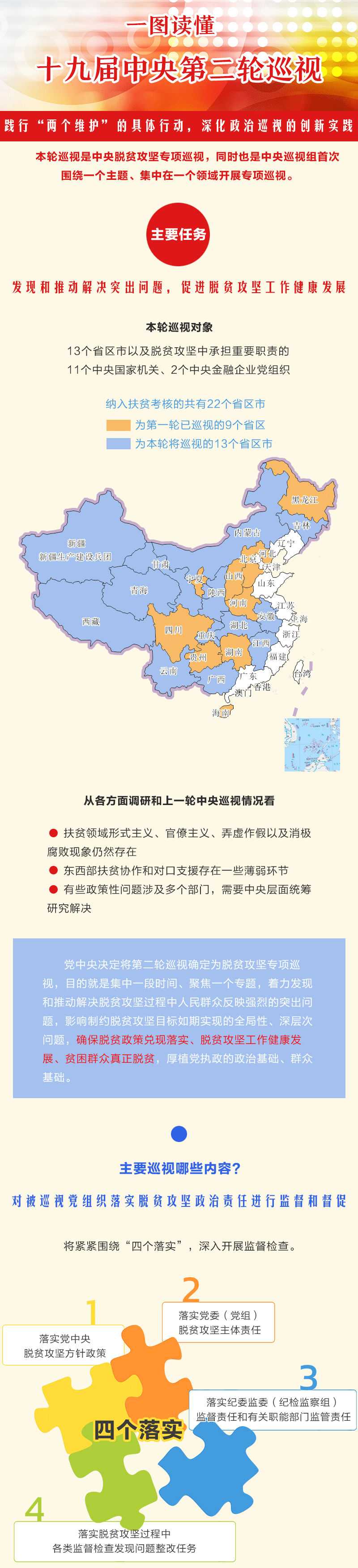 经党中央批准,十九届中央第二轮巡视对内蒙古、吉林、安徽、江西、湖北、广西、重庆、云南、西藏、陕西、甘肃、青海、新疆、国家发展和改革委员会、教育部、民政部、财政部、人力资源和社会保障部、住房和城乡建设部、交通运输部、水利部、农业农村部、国家卫生健康委员会、国务院扶贫开发领导小组办公室、中国农业发展银行、中国农业银行等26个地方、单位党组织开展脱贫攻坚专项巡视。