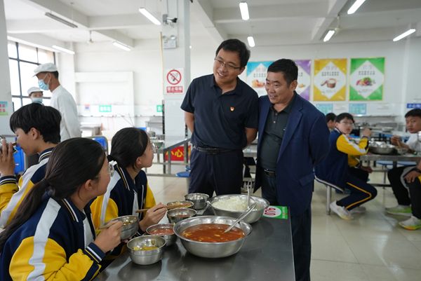 图为张华平(右二)在平邑县赛博初级中学向学生现场了解校园餐情况。张清玉 摄