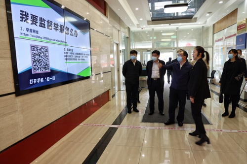 图为新疆维吾尔自治区纪委监委政策法规研究室的同志正在乌鲁木齐市经开区政务服务中心调研基层监督工作情况。