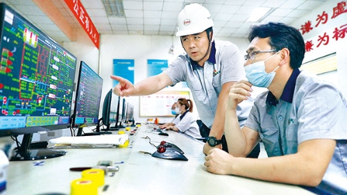 尹力军(左)在锅炉运行车间了解设备运行情况。(荣成市热电燃气集团有限公司供图)