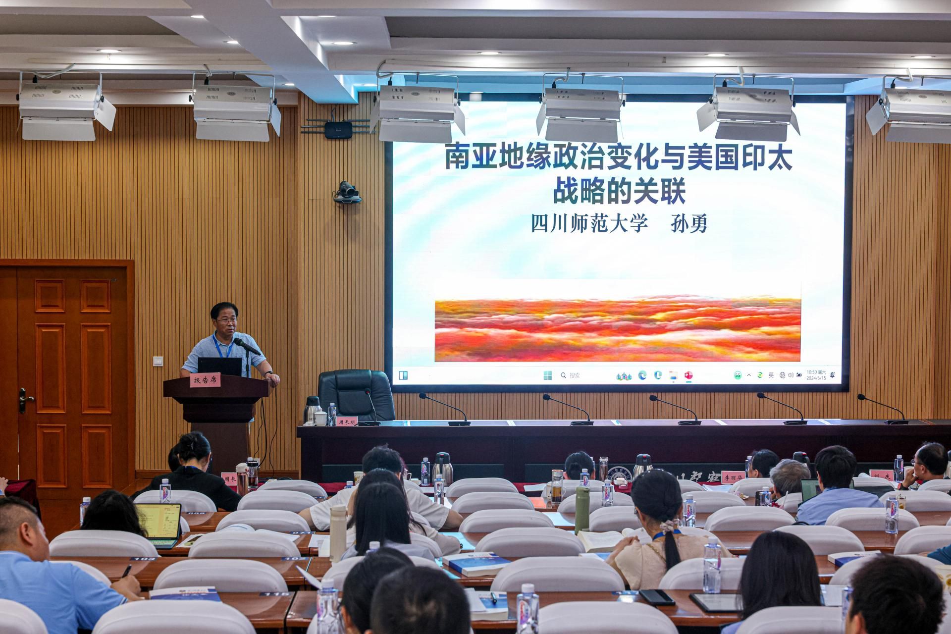 孙勇教授阐释了“亚洲地理中心国家存在着地缘政治的内联性”“传统地缘政治学世界岛说中的南亚与中国的位置”“世界核心区域与南亚地区的诸国”“印度对南亚地缘板块的设想源流”“美国印太战略对包括南亚地区的陆海大布局”“印度对美国的印太战略的思维”“‘印度战略思维模式’的根源”“美印俄中在南亚形成的非均势影响”“美国印太战略在南亚取得进展的态势”“值得思考的南亚局面复杂性变化”十个方面内容,引发大家对处于世界复杂局势背景下国家安全风险挑战的进一步思考。
