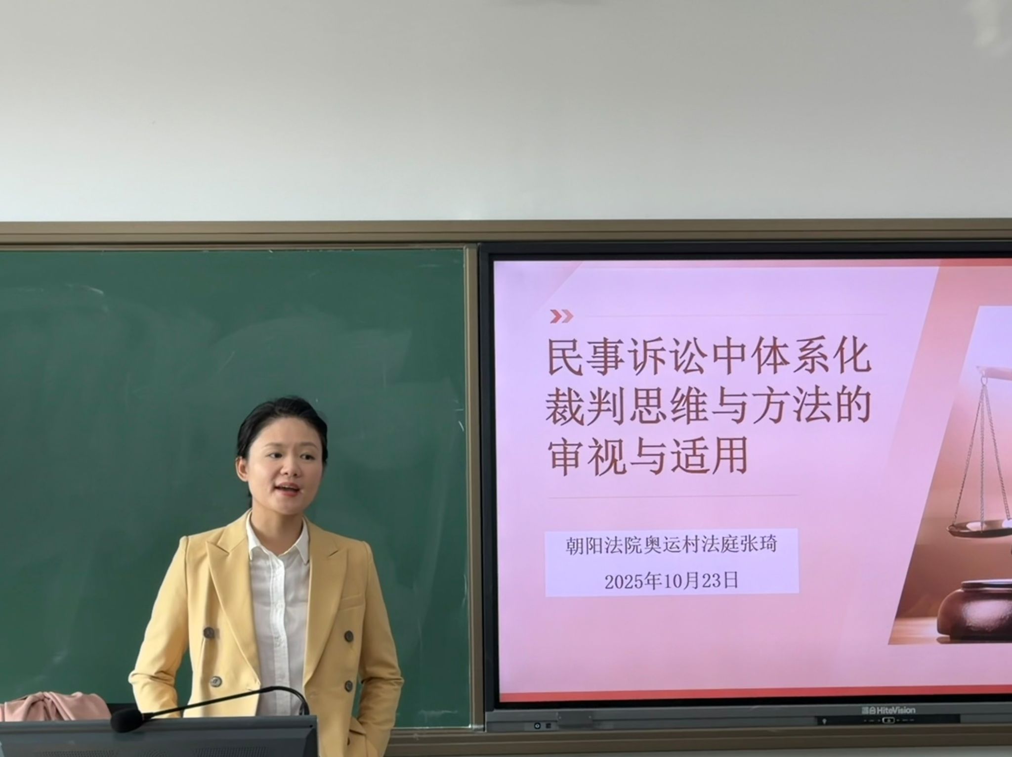 2025年10月23日上午,国际关系学院法学院特邀北京市朝阳区人民法院奥运村人民法庭张琦副庭长,于教学楼323教室举办了一场主题为“民事诉讼中体系化裁判思维与方法的审视与适用”的专题讲座。讲座在我院李丹老师对张庭长及其所在法院、法庭以及讲座主题进行系统介绍后拉开帷幕。