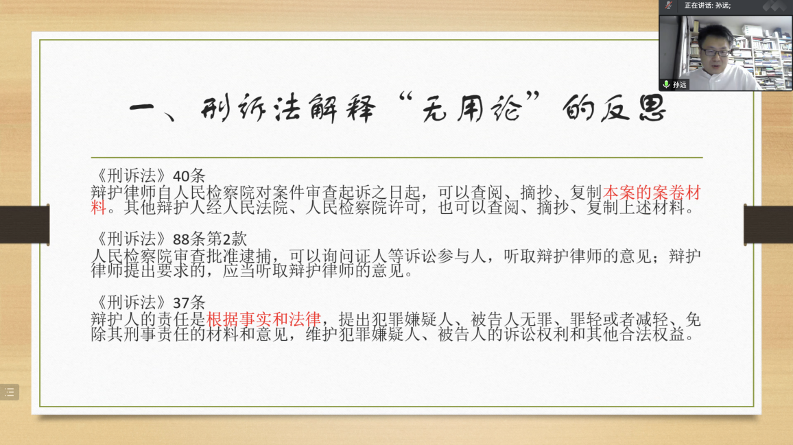 首先,孙远老师提出了对于刑诉法解释“无用论”的反思。孙远老师以若干具体法律规范为事例,对“无用论”的相关论据进行了商榷。同时,孙远老师还以辩护律师阅卷权问题为切入点,加深了同学们对刑诉法解释的认识。