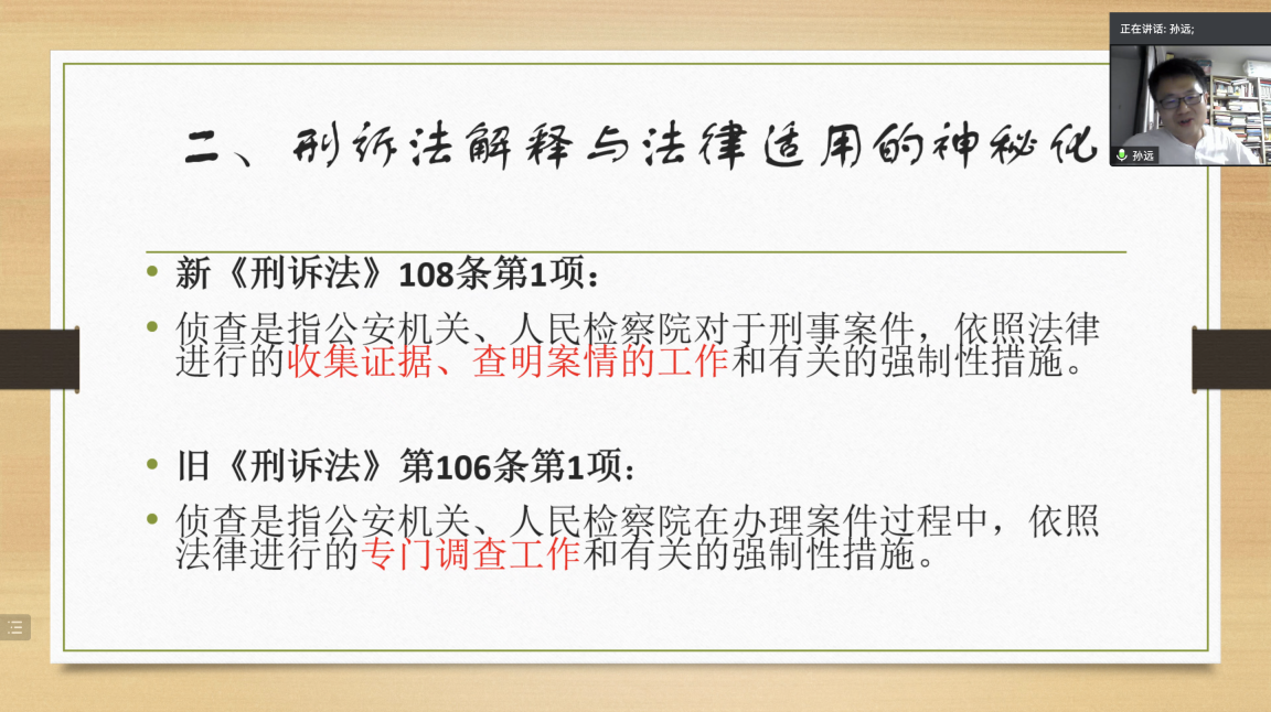 其次,孙远老师介绍了“刑诉法解释与法律适用的神秘化”的问题。孙远老师以新旧《刑诉法》对“侦查”的不同定义为例,详细阐述了新刑诉法将“专门调查工作”一词替换为“收集证据,查明案情的工作”的前因后果,以此再次申明刑诉法解释研究的必要性。