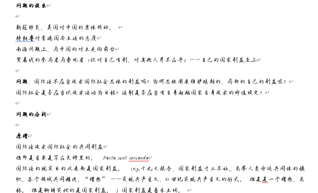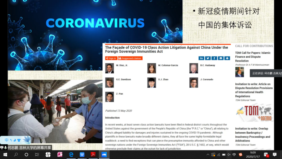 在讲授第一部分时,何教授由浅入深,通过四个国际事件向同学们揭示了国际法的现状与本质。2020年上半年,整个国际社会都被突如其来的疫情裹挟,以美国为首的一些国家将矛头指向奋勇抗疫的中国,并对中国挑起了集团诉讼,虽然在美国FSIA国家主权豁免法的阻挡下,这场诉讼不可能有结果,但也能看出,在国际大义面前,各国自己的利益在各种博弈中更胜一筹。与之类似的事件还有“中国香港暴乱事件”、“南海事件”、“中美贸易战”等。这些事件无一不体现了国家利益在各国行动中的导向作用。国际法本该是维护国际社会整体利益的法律,却总是被用来维护个别国家的利益,这不仅体现了整体和局部的矛盾,也是理想和现实的冲突,而现实却总是超越理想,所以如何调和整体与局部、现实与理想的关系,从而进一步促进国际法的发展就成为了主要问题。