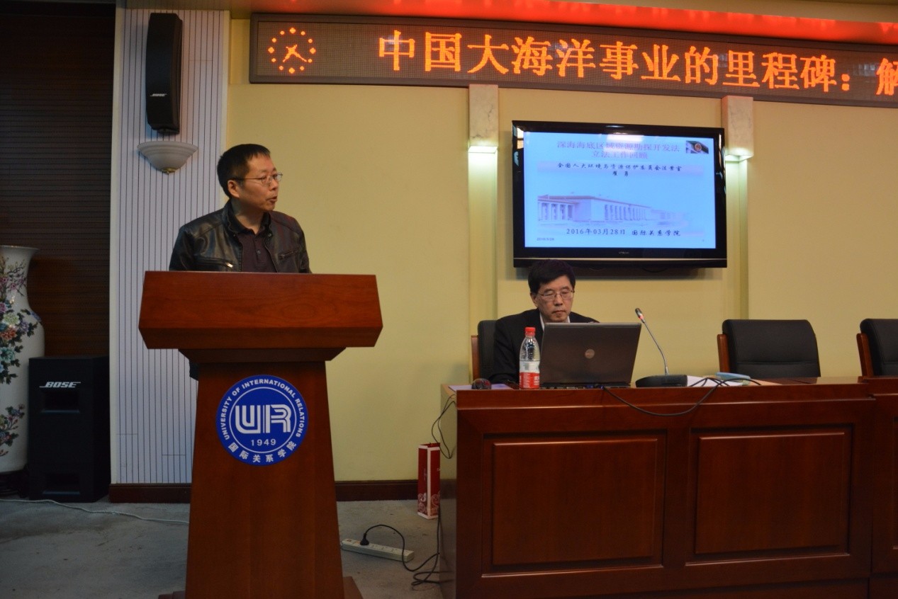 3月28日晚7时,全国人大环资委法案室主任、中国人民大学法学院客座教授翟勇应邀前来我校,于学术交流中心新闻发布厅成功举办“中国大海洋事业的里程碑——解读《深海区域资源勘探开发法》”专题讲座。国际关系学院副校长吴慧、法律系主任李汉军出席本次讲座,法律系各级研究生、本科生前来旁听本次讲座。