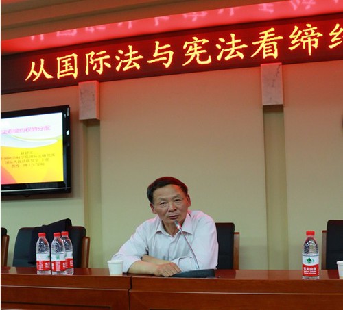 2013年5月8日晚,中国社会科学院国际法研究所教授赵建文应邀来我校举办主题为“从国际法与宪法看缔约权分配”的讲座。赵建文教授是国际法学知名学者,现为中国社会科学院国际法研究所国际人权法研究室主任,博士生导师,在国际法基本理论、国际人权法和海洋法等领域都有深入研究,学术成果丰富。