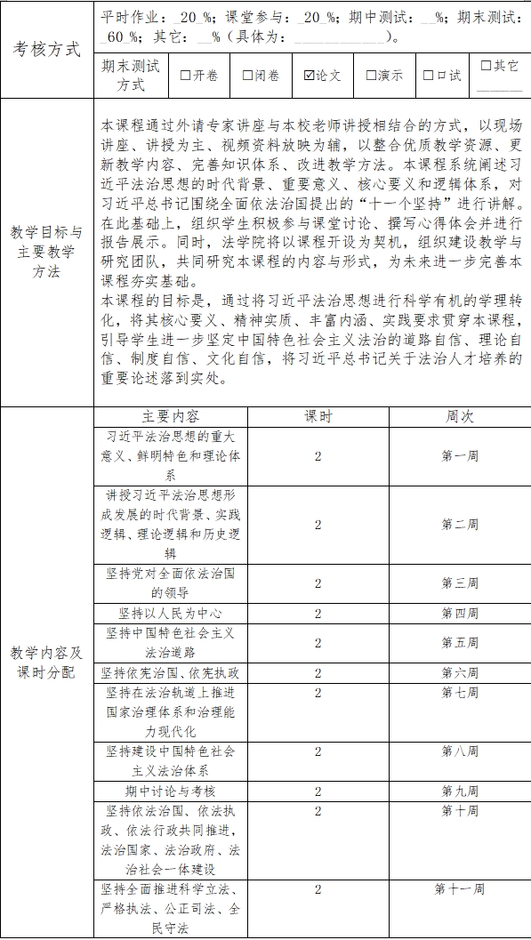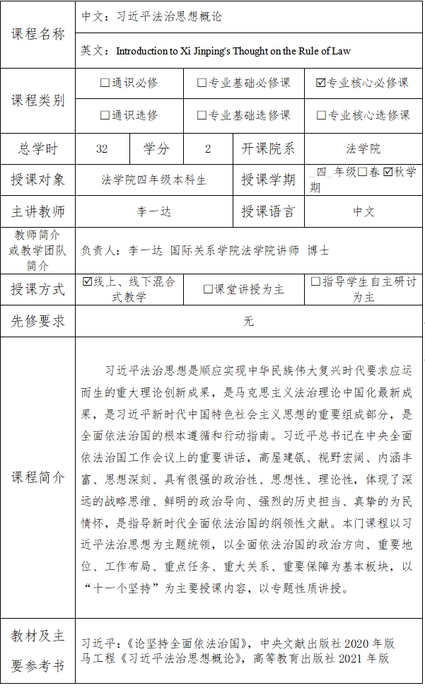 课程英文名称:Introduction to Xi Jinping's Thought on the Rule of Law