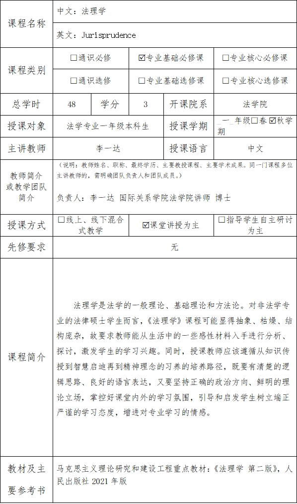 教材及主要参考书:马克思主义理论研究和建设工程重点教材:《法理学第二版》,人民出版社2021年版