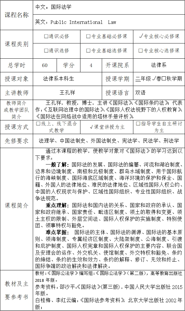 课程英文名称:Public InternationalLaw