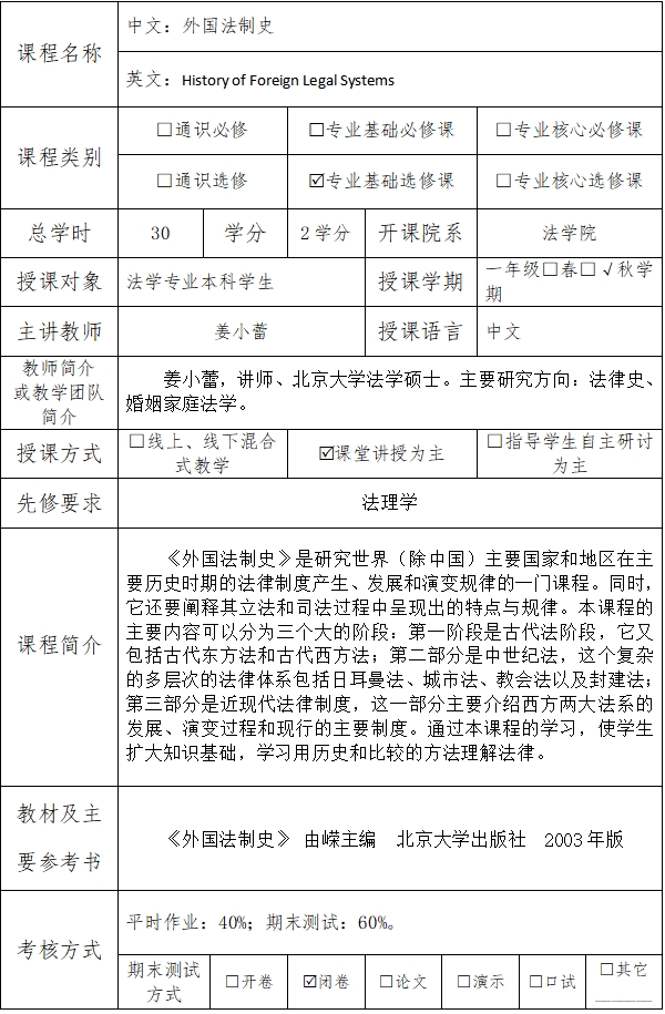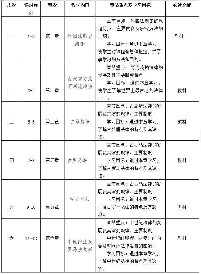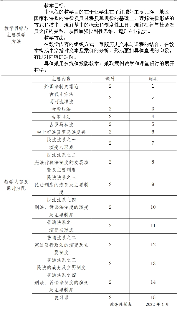本课程的教学目的在于让学生在了解域外主要民族、地区、国家和法系的法律发展过程及其规律的基础上,理解法律形成的方式和技术,理解基本的概念和制度性工具,理解法律与社会发展之间的关系,从而加强批判性思维,提升专业能力。