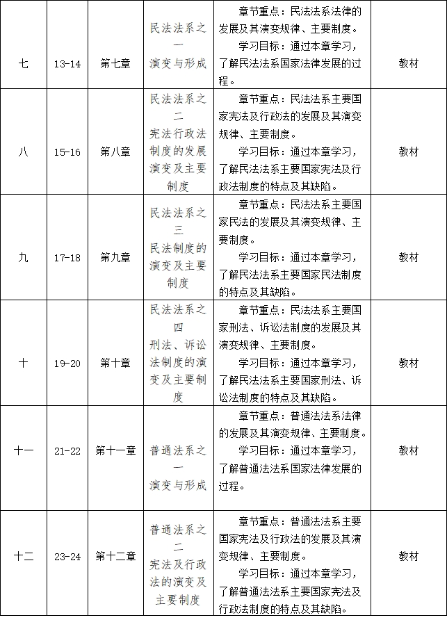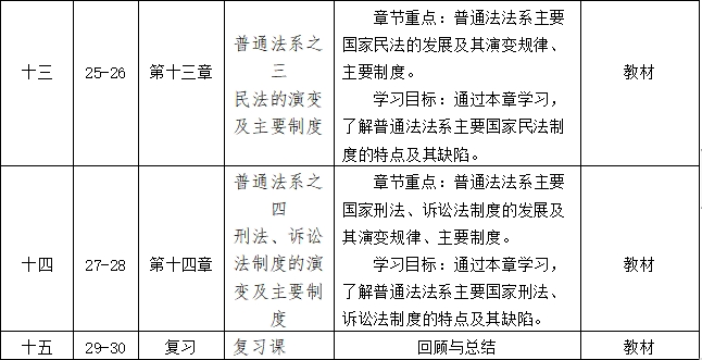 本课程的基本要求是让学生掌握不同法律发展的过程中面对的主要问题,及其形成的主要概念、基本制度,对法律基本概念、制度、原理等的形成有所理解,具备比较思考判断的能力。