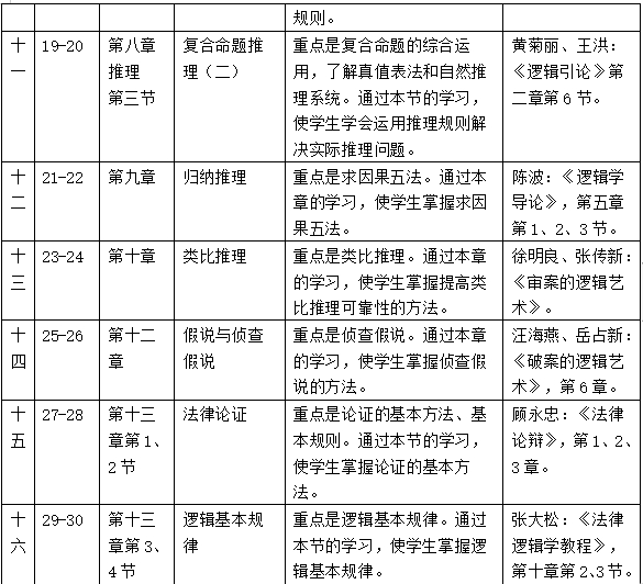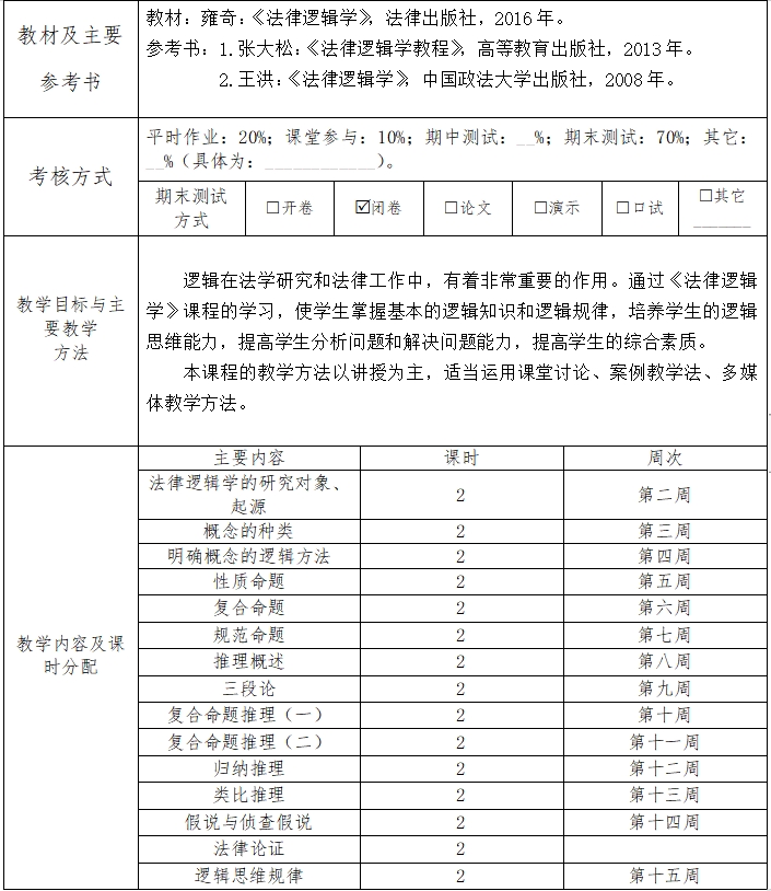 根据学校教学计划的整体安排,本课程的学时安排为30学时,法律系一年级第一学期开设。本课程教学的主要内容包括逻辑基本规律、概念、命题、三段论、命题逻辑、归纳逻辑、侦查逻辑、法律论证等。具体安排如下: