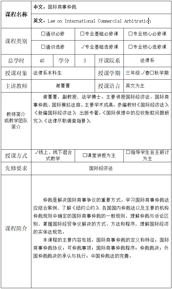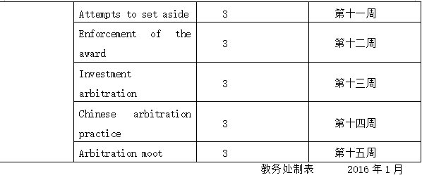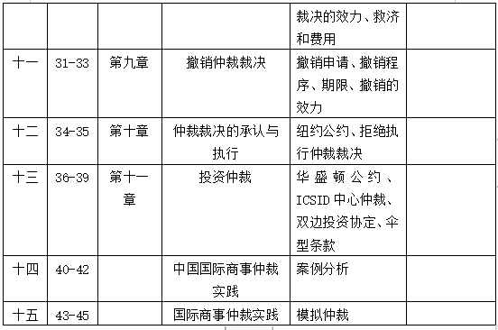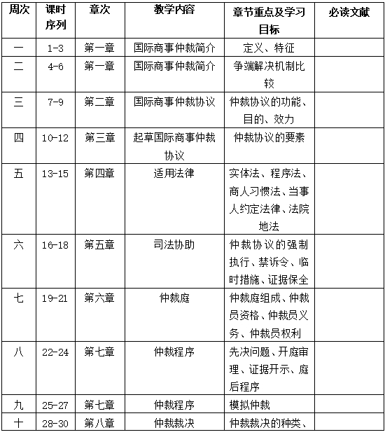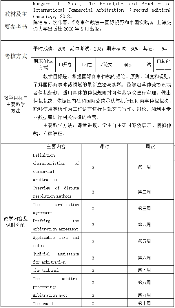 教学目的和基本要求是:掌握国际商事仲裁的理论、原则、制度和规则,了解国际商事仲裁领域的最新立法与实践,能够起草仲裁协议或者仲裁条款,适用具体的仲裁规则对可仲裁争议进行审理,做出仲裁裁决,依据国内法和国际公约承认与执行国际商事仲裁裁决。能够使用英语作为工作语言进行仲裁文书写作、辩论,和利用专业数据库进行相关法律的检索。