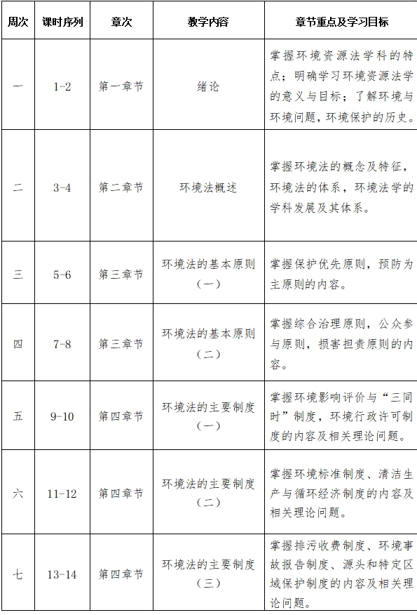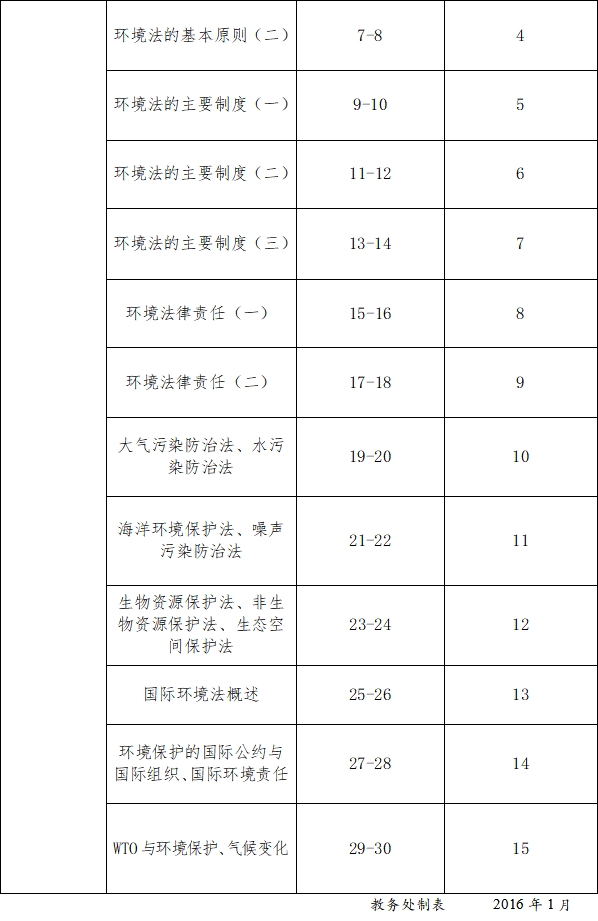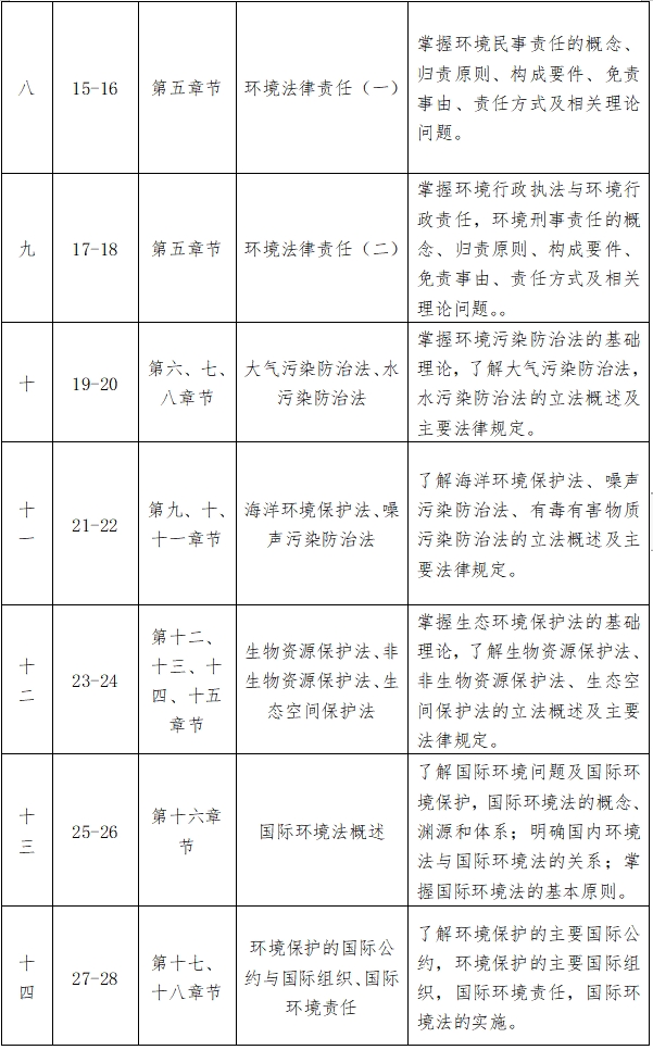 2.讲授环境污染防治法,具体包括环境污染防治法概述、大气污染防治法、水污染防治法、海洋环境保护法、海洋环境保护法、噪声污染防治法、有毒有害物质污染防治法等。