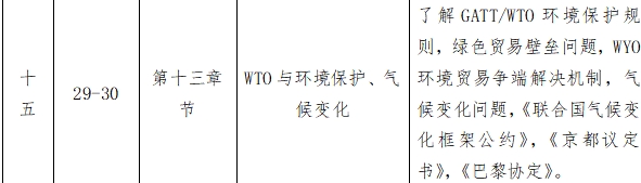 4.讲授国际环境法基础,具体包括国际环境法概述、环境保护的国际公约与国际组织、国际环境责任和国际环境法的实施、WTO与环境保护、气候变化等。