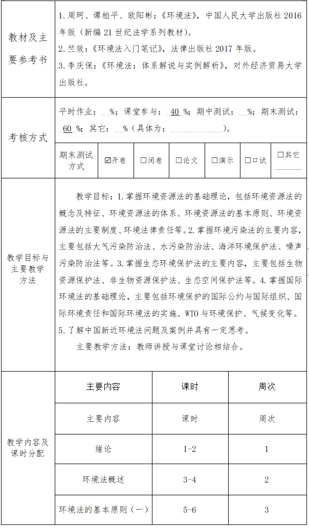 教材及主要参考书:1.周珂、谭柏平、欧阳彬:《环境法》,中国人民大学出版社2016年版(新编21世纪法学系列教材)。2.竺效:《环境法入门笔记》,法律出版社2017年版。3.李庆保:《环境法:体系解说与实例解析》,对外经济贸易大学出版社。