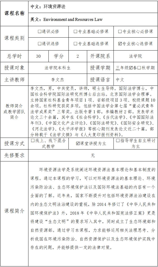 3.讲授生态环境保护法,具体包括生物资源保护法、非生物资源保护法、生态空间保护法等。