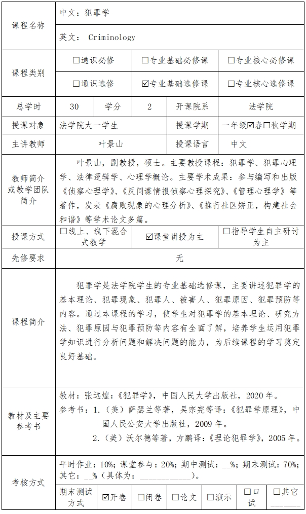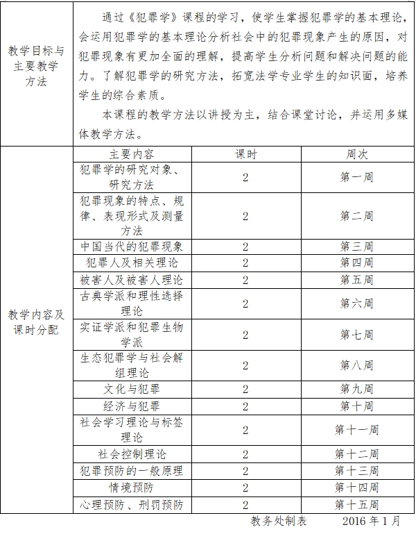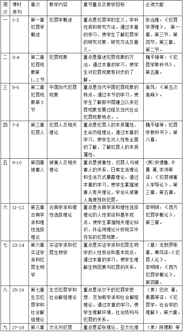 根据学校教学计划的整体安排,本课程的学时安排为32学时,法学院一年级第二学期开设。本课程教学的主要内容包括犯罪学的历史发展、犯罪现象、犯罪人、犯罪被害人、犯罪原因的有关理论、犯罪预防等。具体安排如下: