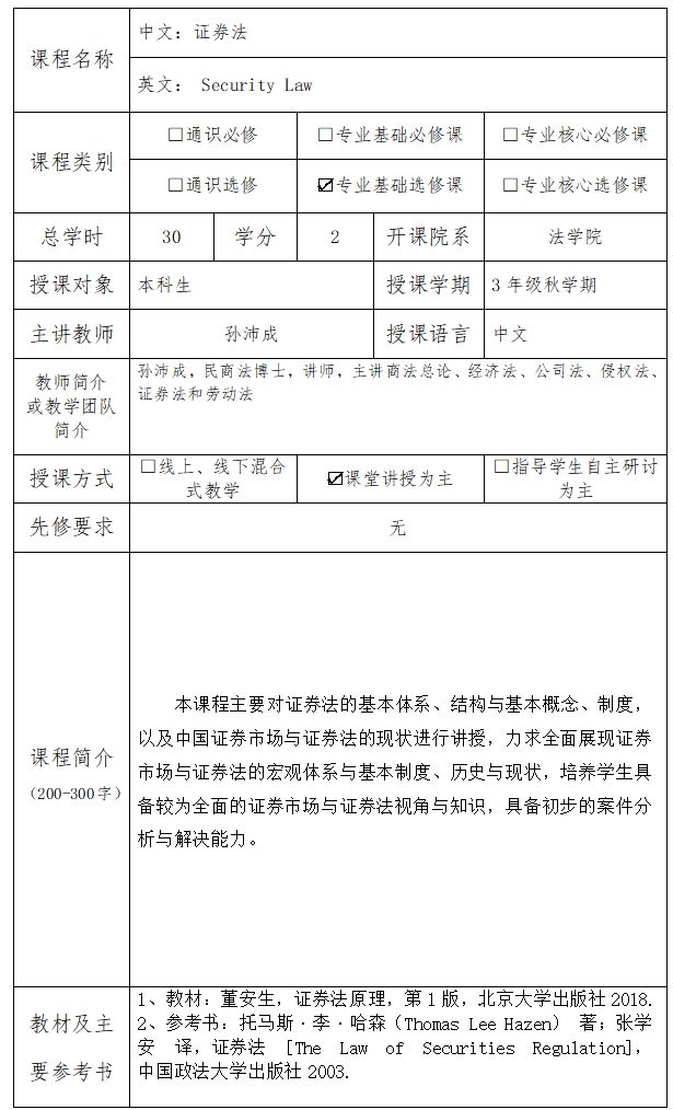 教材:董安生,证券法原理,第1版,北京大学出版社2018。