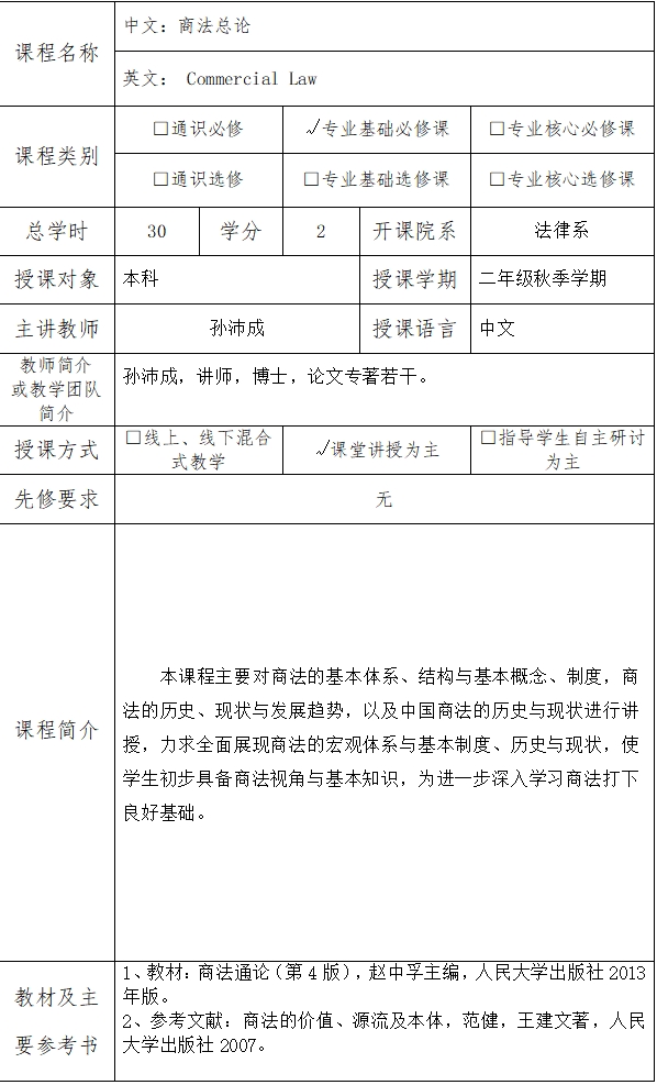 教材:商法通论(第4版),赵中孚主编,人民大学出版社 2013年版。