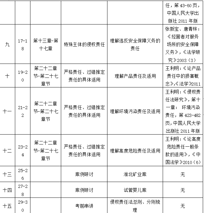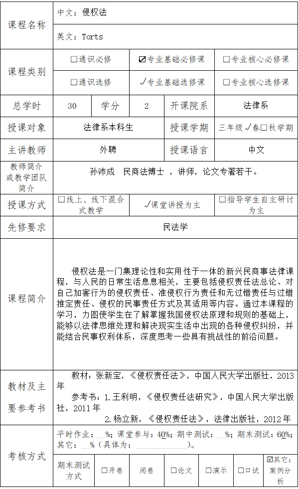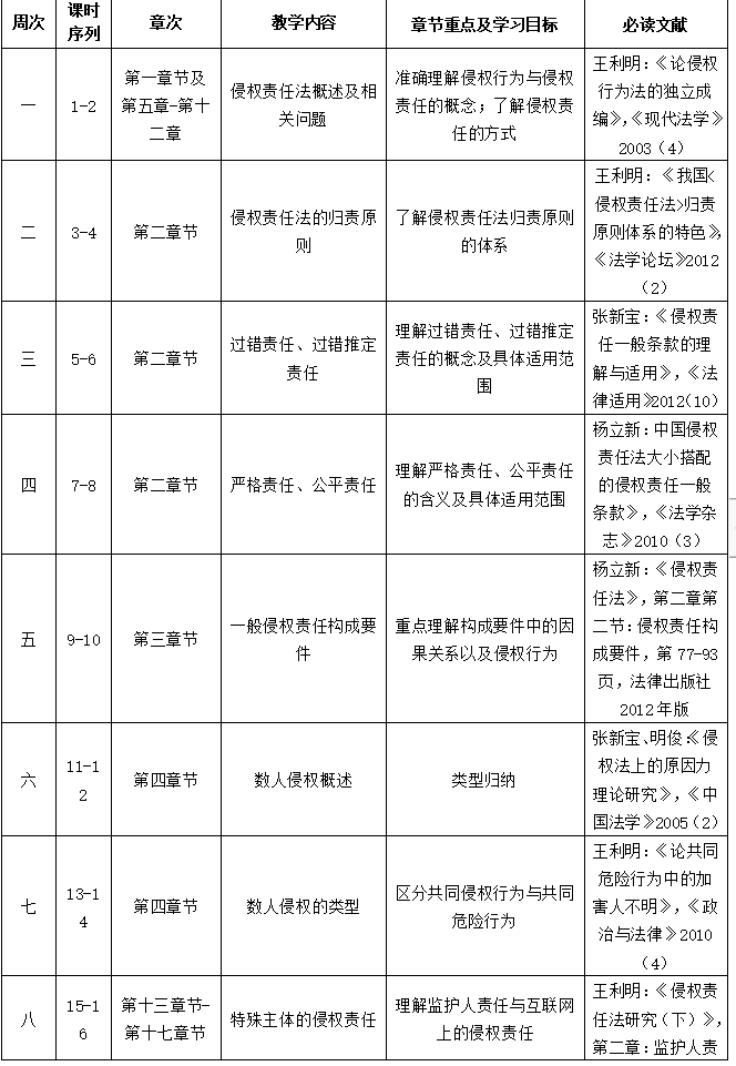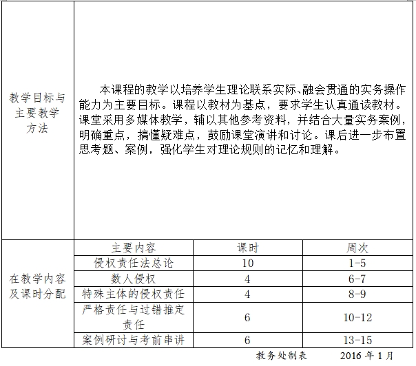 根据学校教学计划的整体安排,本门课程的学时安排为30学时,三年级第二学期开设。课程主要讲授侵权责任法总则,数人侵权行为,特殊主体的侵权责任,严格责任与过错推定责任,侵权的民事责任方式及其适用。在讲授侵权法基础知识的同时,辅之典型案例,力求理论与实践相结合,探求实务中相关问题的解决之道。