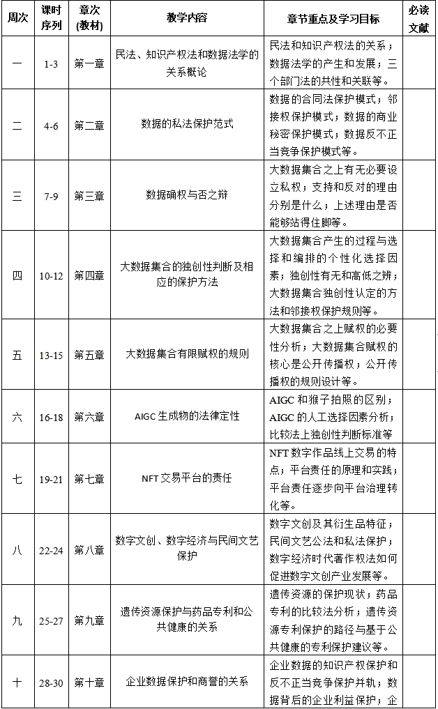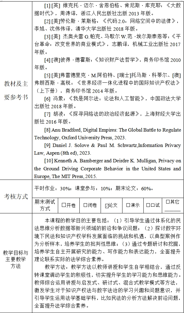 本课程的教学目的主要包括:(1)引导学生通过体系化的民法思维分析数据等新兴领域的前沿和争议问题;(2)探讨数字环境下民法和知识产权学科发展面临的挑战和机遇,以典型案例作为分析样本,培养学生的批判性思维;(3)通过专题研讨和挖掘,培养学生自主开展研究的能力、写作能力和表达能力,全面提升理论联系实际的法学综合素养。