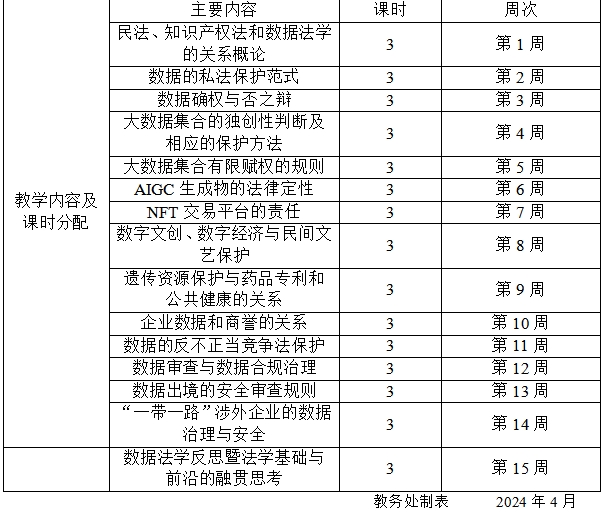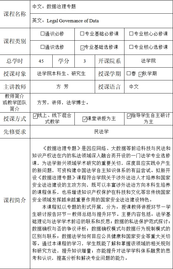 《数据治理专题》是因应网络、大数据等前沿科技与民法和知识产权法在内的私法领域深入融合而开设的一门法学专业选修课,为法学新兴领域学术研究的重要关切,深度回应实践中产生的新问题,可资构建中国法学自主知识体系的有益尝试。拟新开设《数据治理》课程符合学院关于涉外法治人才培养和国家安全法治建设的主攻方向,既可以丰富涉外法治方向本科生培养的课程体系,也将增进知识产权保护在科技和文化等非传统国家安全领域发挥着越来越重要作用的国家安全法治建设特色。