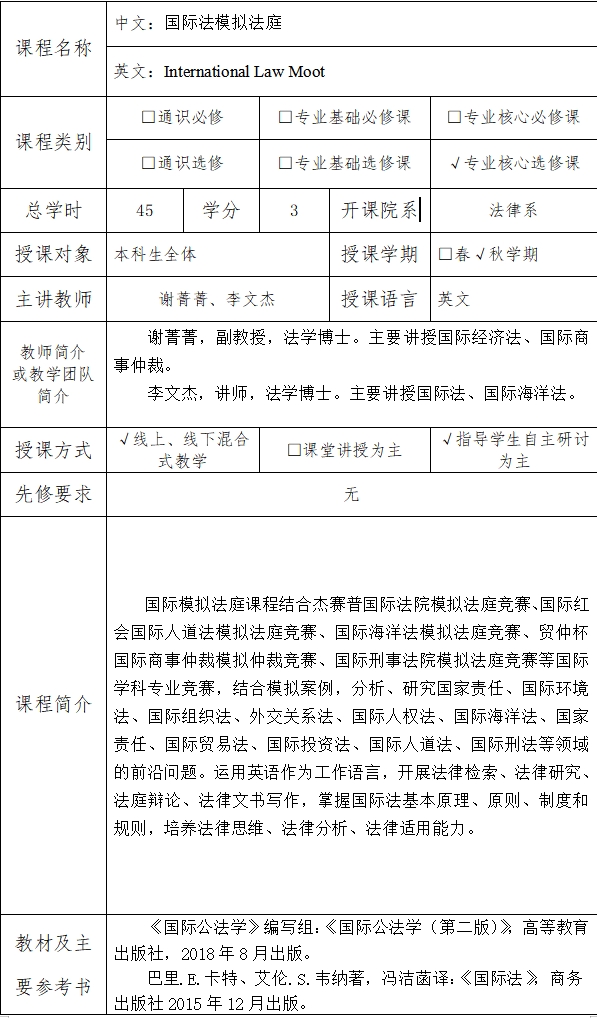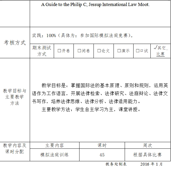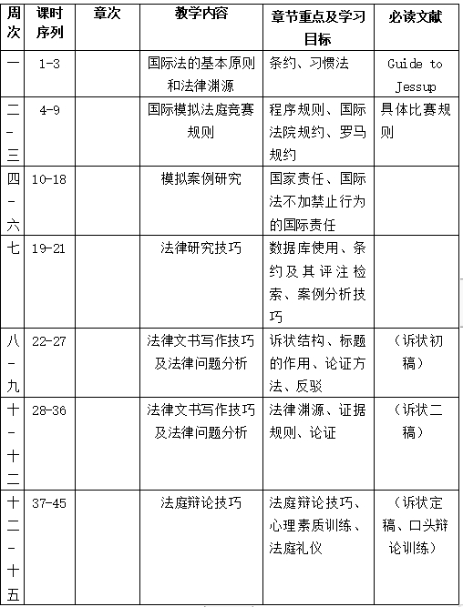 教学目的和基本要求是:了解和掌握国际法基本知识、基本原则和规则,能够通过参加杰赛普国际法模拟法庭竞赛、国际红会国际人道法模拟法庭竞赛、国际刑事法院模拟法庭竞赛等学科专业竞赛,训练法律研究、法律写作、法庭辩论等律师技能,熟悉国际法解决国家间争议和追求个人刑事责任的程序。