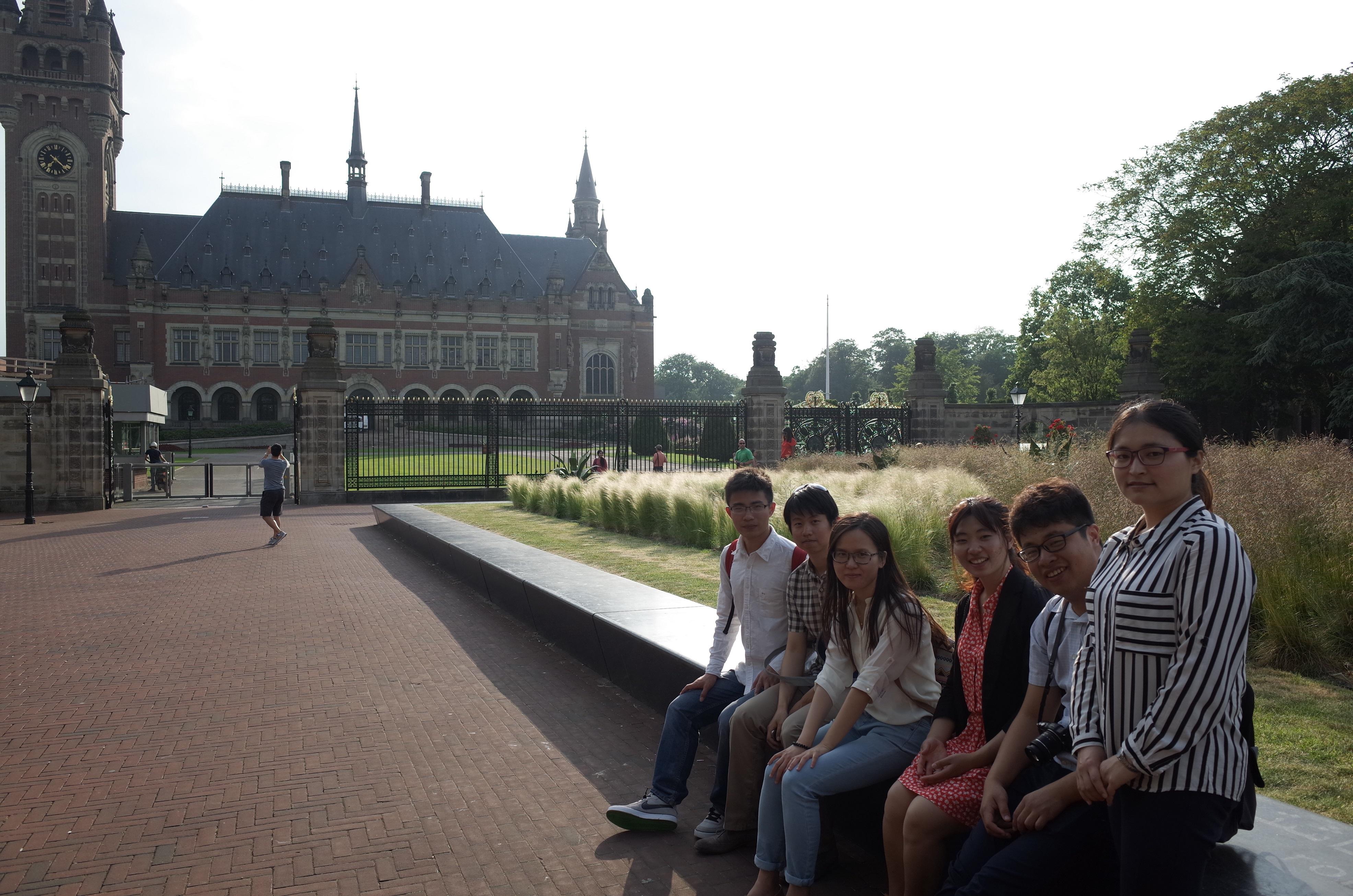 国际关系学院代表队与法律系毕业生解阳在国际法院前合影