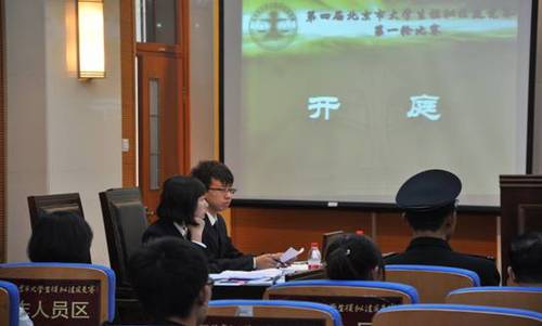 法律系代表队派出了10级何美琪、张大千、白明亮三位同学上场比赛,由何美琪和张大千担任公诉人,白明亮任证人。参赛对方为北京农学院的同学,他们分别担任辩护人和被告人。