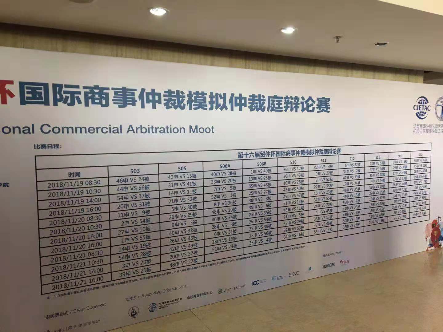2018年11月19日至11月23日,第十六届“贸仲杯”国际商事仲裁模拟仲裁庭辩论赛在国际商会大厦举行。来自全国的54支代表队就模拟案件涉及的仲裁协议适用法律、黑客取得证据的可接受性、国际货物买卖中的情势变更和不可抗力等问题等提交法律意见书和开展模拟仲裁。