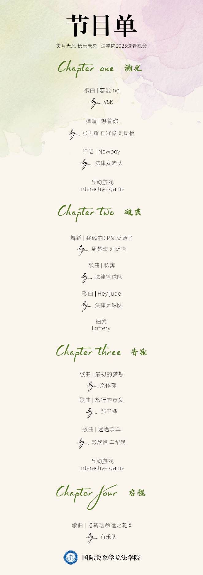 大家好!我是24级的萌新法师黄韵琳。很荣幸能担任此次送老晚会主持人,这也是我第一次担任学校活动主持人,在国关法学院的时光里我体悟了多样的大学生活,也感受到了满满的温情。时光传递新的交接棒,倾听了21级师哥师姐们的学习心路后,收获干货满满,希望可以在晚会上与大家共同留下美好的回忆!