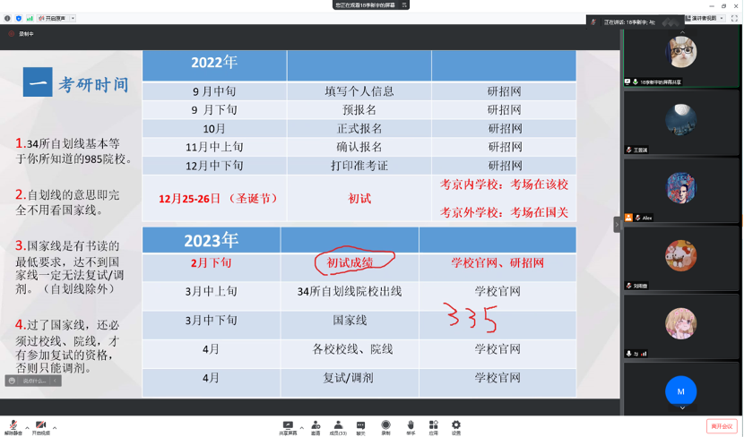 第三位分享的是肖穗兰师姐,她考研上岸中央财经大学法律硕士。学姐在考研书籍方面做出了许多分享,政治推荐肖秀荣和腿姐,英语推荐朱伟5500词和红皮书,专业课则推荐考试分析新旧版本。学姐还介绍了自己的时间规划,3月到6月准备第一轮专业课和朱伟5500词,日均5h,7月到9月进行专业课第二轮,英语和政治,时间也应有所增加,9.10月则要加上政治一轮的学习,时间增加到7-8h,等到10月中旬至12月,便应该进行专题、技巧与背诵了,在最后的12月,各项都进入冲刺阶段,时间上自然是尽力挤压。最后,学姐还提醒后辈们注意英文书写,这在作文板块很重要。