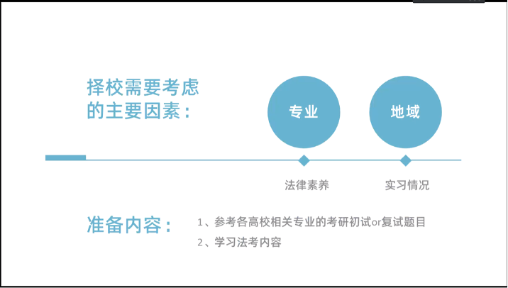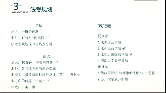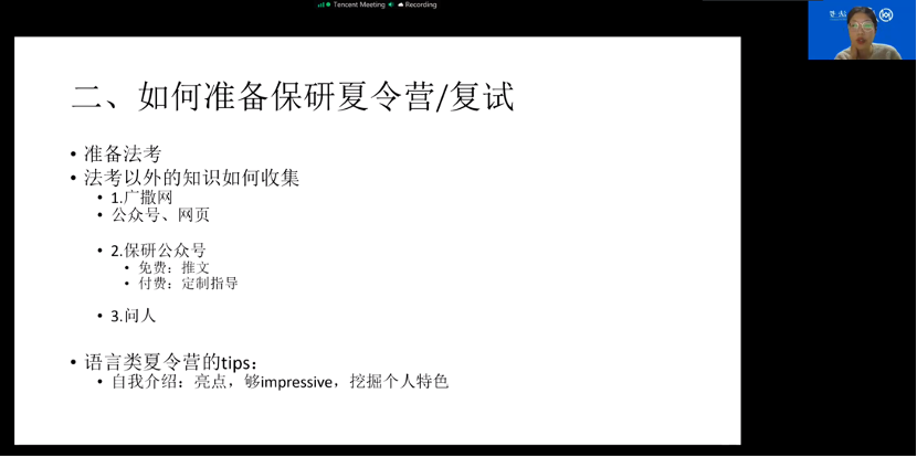 第二位分享的是保研至北外民商法专业的王馨逸学姐。她首先谈到了保研的硬性要求,并简要介绍了自己的履历与科研经历。接下来,她介绍了保研的流程与几个重要时间点,可以通过往届学长学姐的经验、相关公众号等渠道获取保研信息。接着,她在保研材料准备方面向我们进一步地介绍了具体的要求,简要介绍了自己的预推免和夏令营经历,强调要注重英语能力的培养。最后,她结合自己的学习经历分享了自己的法考规划、时间安排与老师选择。