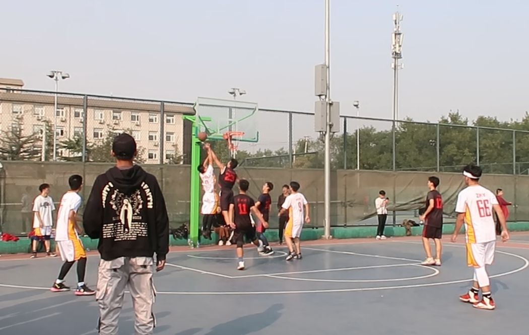 接着,23号艾尼卡尔罚球线外空切接77号曹伟康妙传面对两人夹击强硬上篮打成“2+1”。开场5min,对方中锋试图上篮遭遇23号艾尼卡尔迎面大帽。开场7min,面对公管内线三人联防,23号艾尼卡尔一记丝滑的小勾手将篮球放入篮筐。随后,23号艾尼卡尔抓住对方传球失误巧妙抢断前场一打零快攻上篮打进。第9min,11号宋世琦弧顶持球巧妙传导成功打出一次“1号战术”,稳稳命中底角三分。第一节比赛结束,我系11:7领先。