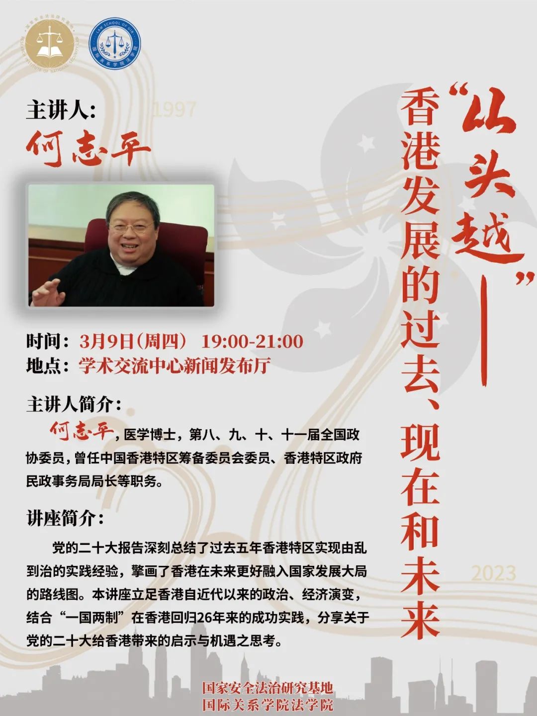 党的二十大报告深刻总结了过去五年香港特区实现由乱到治的实践经验,擎画了香港在未来更好融入国家发展大局的路线图。本讲座立足香港自近代以来的政治、经济演变,结合“一国两制”在香港回归26年来的成功实践,分享关于党的二十大给香港带来的启示与机遇之思考。