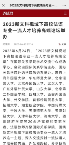 此次高端论坛由国际关系学院主办,国际关系学院外语学院法语系承办。论坛立足“新文科”背景,主要从区域国别研究、课程思政建设和翻译人才培养三方面探索了法语专业一流人才培养的新路径、新模式、新方案,为国际关系学院法语专业高质量发展和一流人才培养注入了新动力,促进了全国高校法语专业在学科建设和人才培养方面的新探索,也为外语专业如何更好地服务国家战略需求,为建设教育强国培养更多更优秀的复合型人才提供了新思路。