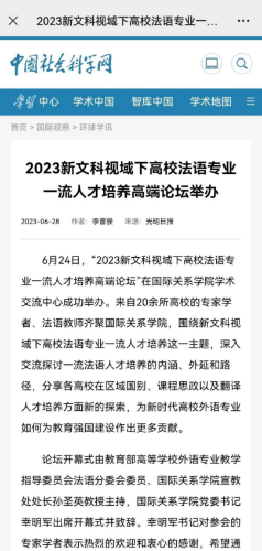 2023年6月24日,“2023新文科视域下高校法语专业一流人才培养高端论坛”在国际关系学院学术交流中心成功举办。来自全国20余所高校的专家学者、法语教师齐聚国际关系学院,围绕新文科视域下高校法语专业一流人才培养这一主题,深入交流一流法语人才培养的内涵、外延和路径,分享各高校在区域国别、课程思政以及翻译人才培养方面新的探索,探讨新时代高校外语专业如何为教育强国建设作出更多贡献。