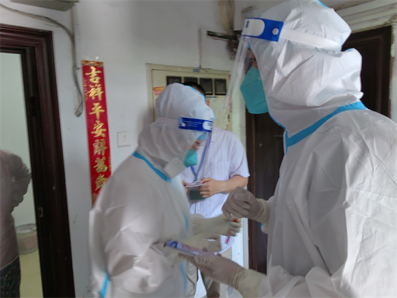 国关社区党支部书记王敬与医务人员上门为居民进行核酸采样